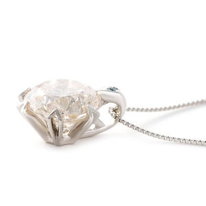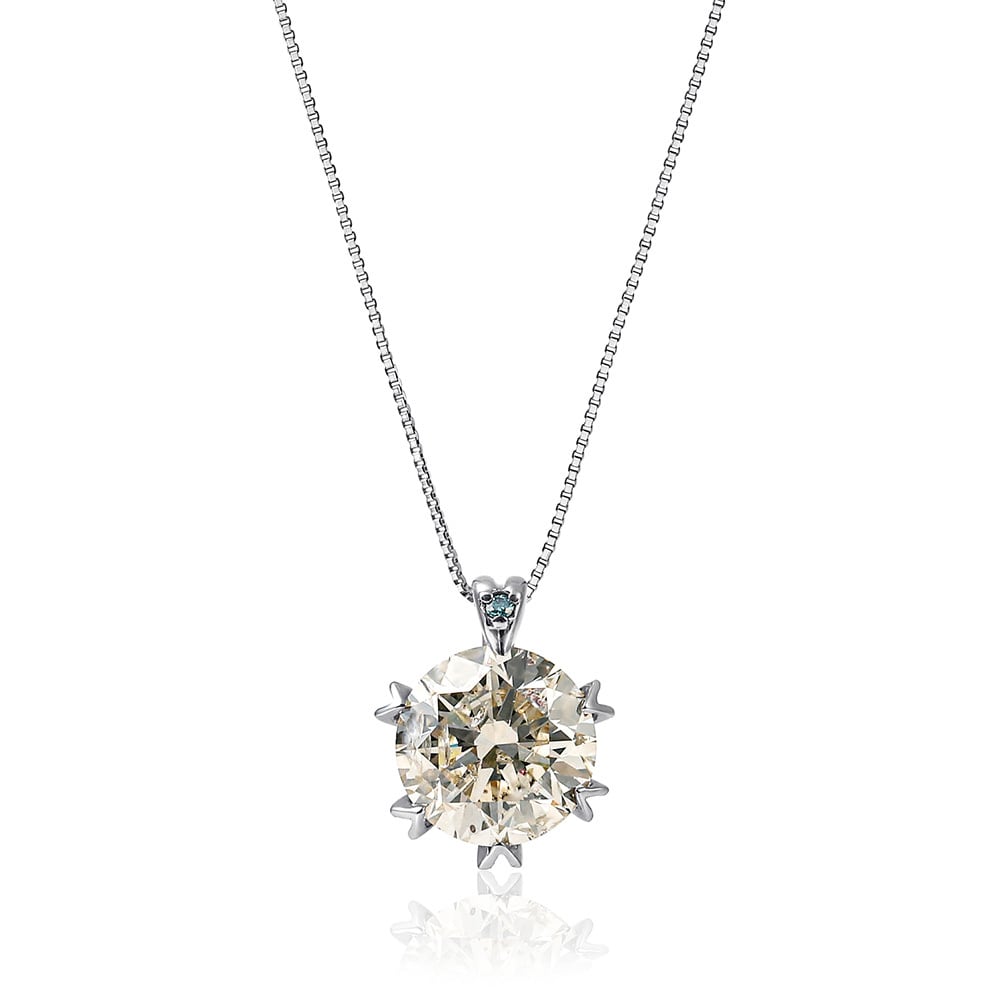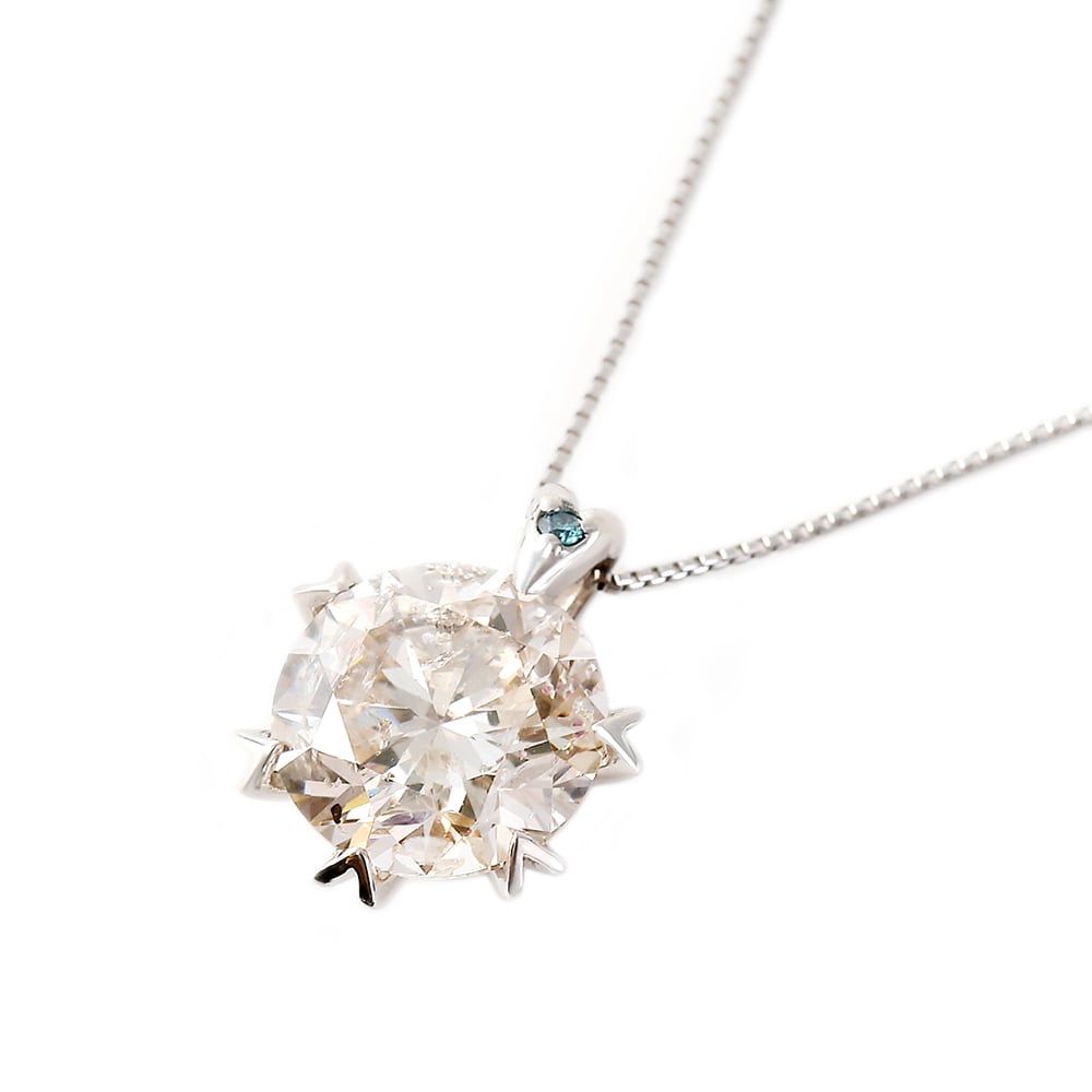 バチカン部分には0.004ctのブルーダイヤモンドをアクセントに配置し、爪も特徴のあるデザインを採用した、胸元で存在感のある1カラットダイヤモンドネックレスとなっております。